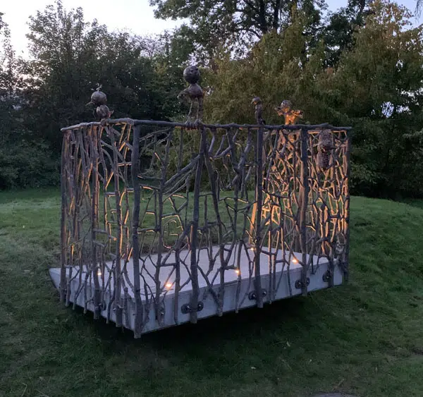 Skulpturen Fågelkärleken bygger på barnens och ungdomarnas egna berättelser, drömmar och önskningar. Balkongen svävar över gräsmattan och skapar både rum och utsikt. I balkongens grenverk har konstnärerna smugit in budskap, liksom på fåglarna. Gå nära och se om du kan hitta dem.