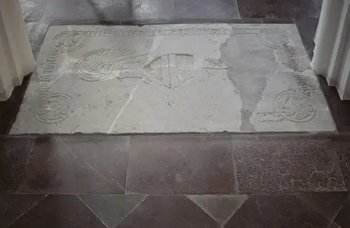 Stenen hade sedan återanvänts som tröskelsten under kyrkans västportal. Gravstenen är av utomordentligt hög kvalitet med text som berättar om dödsår och dödsdag samt med en avbildning av Conrads vapensköld med strutsplymskrönt tunnhjälm.