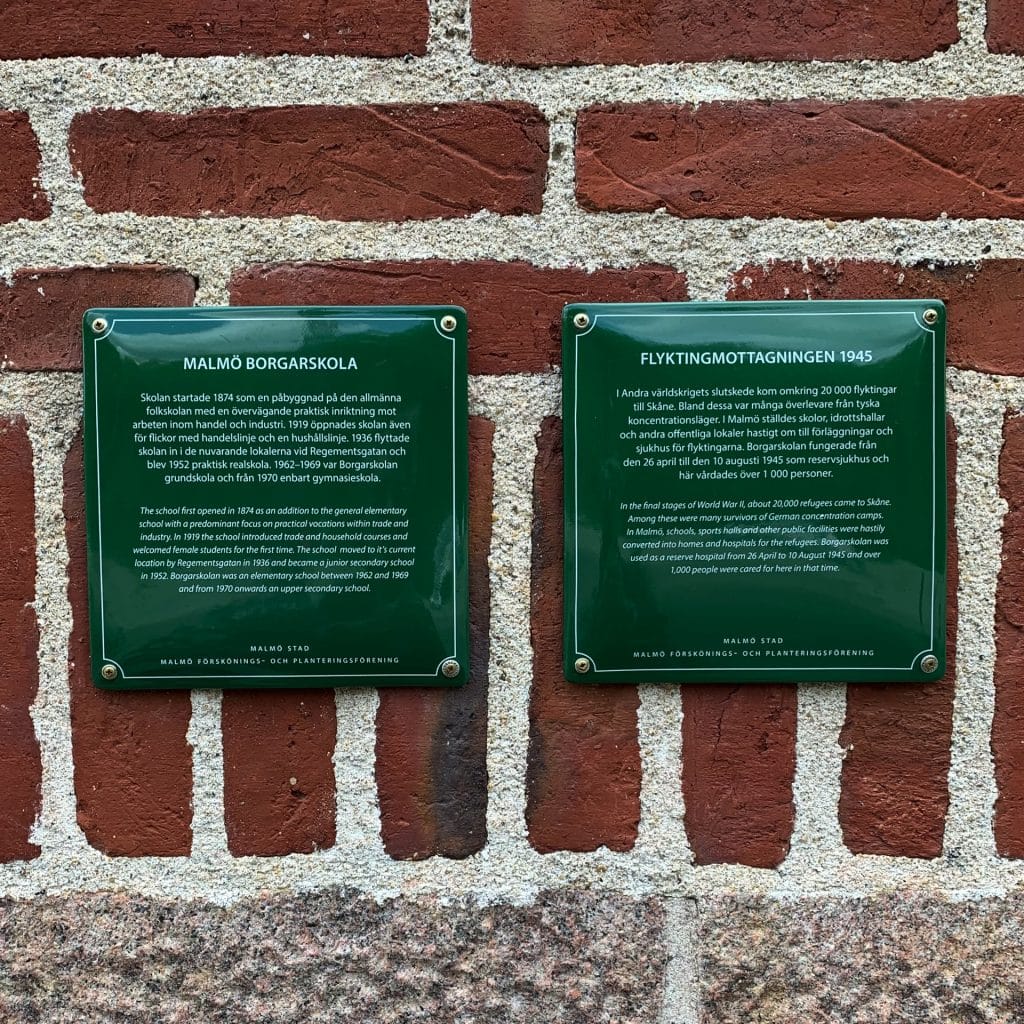 Redan 1958 medverkade Föreningen till att det sattes upp 12 minnesskyltar med information om vissa äldre byggnader i Malmö. Flera av dessa skyltar är tyvärr borta idag.