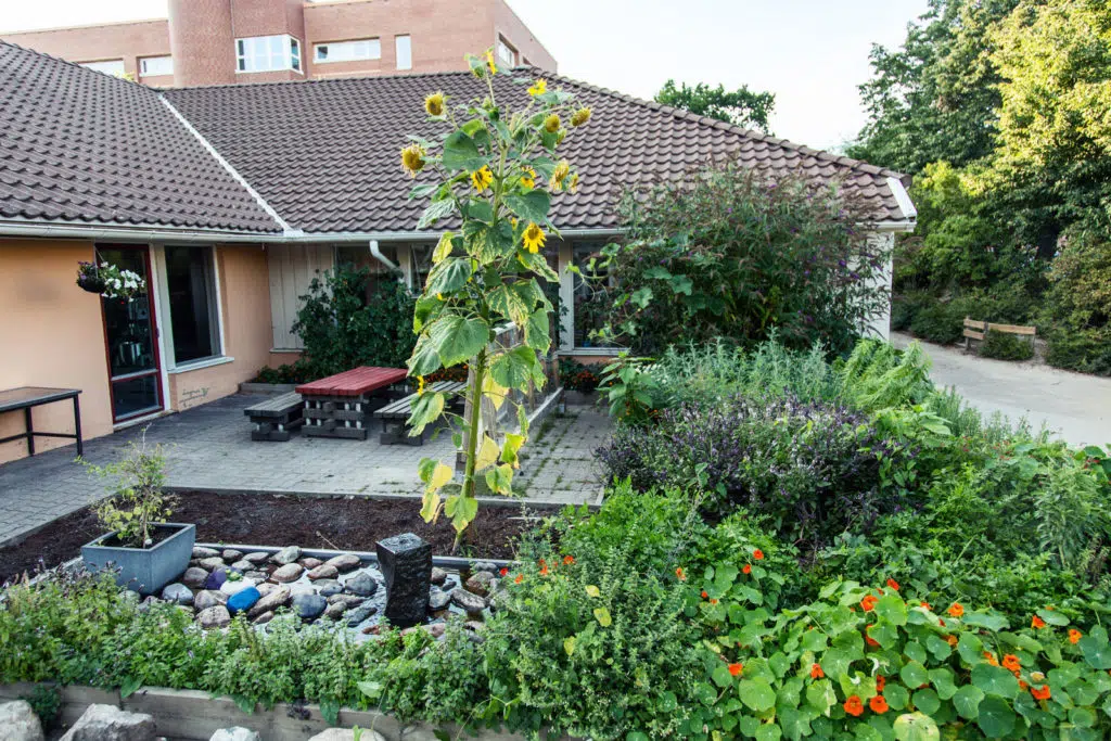 Längst inne på gården finns solroslandet. Frön förodlas i växthuset och på våren under ”gårdsfesten” utplanteras solrosorna som ger en vacker och stark upplevelse för både barnen som vistas på gården och för de hyresgäster som bor mittemot.